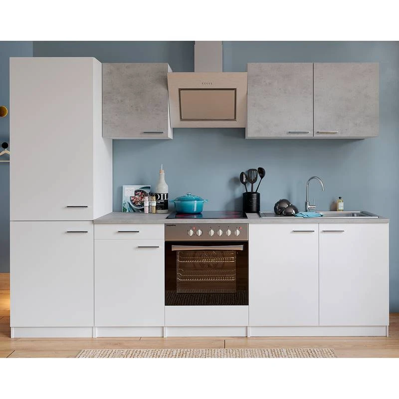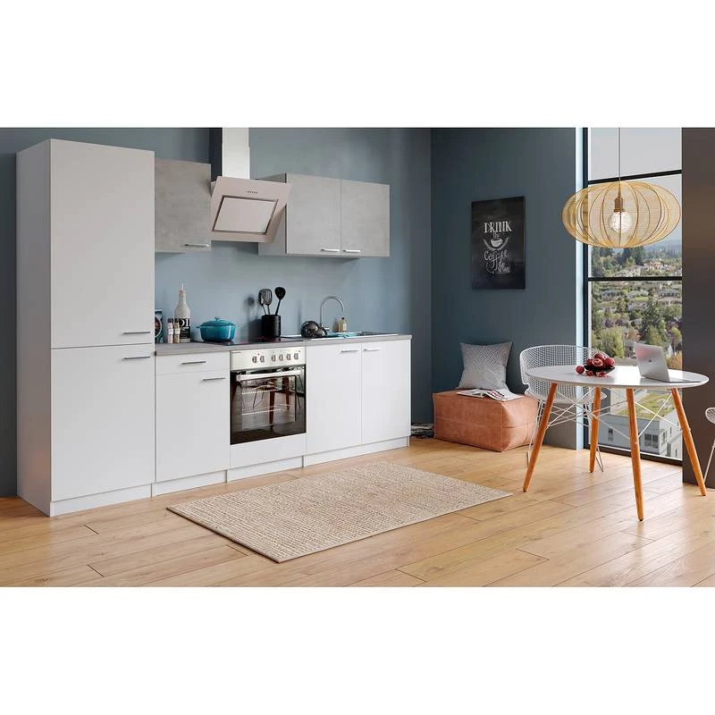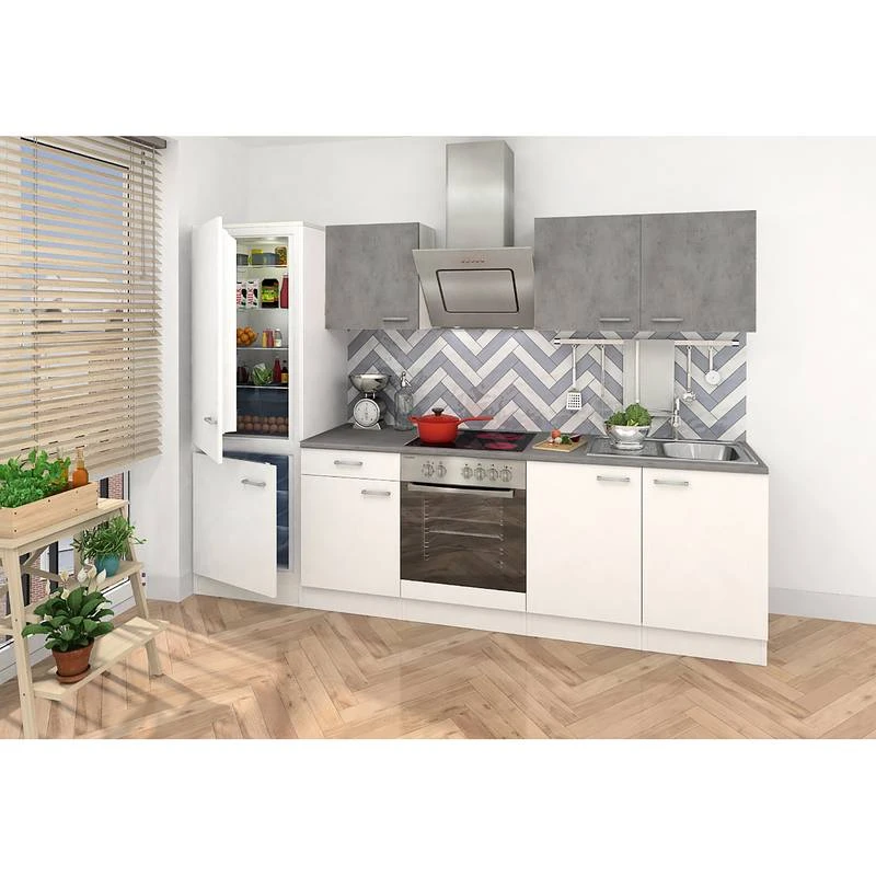 - Électroménager inclus : 1 four encastrable, 1 plaque vitrocéramique, 1 réfrigérateur / congélateur encastrable et 1 hotte aspirante inclinée,