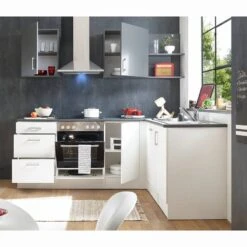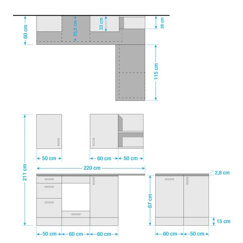 - Cuisine comprenant 1 meuble haut 60, 1 étagère 50, 1 meuble bas 50, 1 meuble haut 50, 1 meuble sous évier 50, 1 meuble pour four encastrable 60, 1 meuble pour lave-vaisselle 60 et 1 plan de travail 220